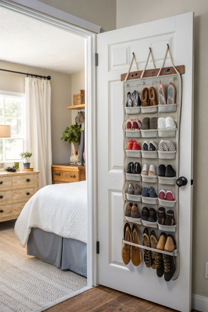 Don’t just think shoes! Repurpose an over-the-door shoe organizer for scarves, belts, or even small clutches. The fabric pockets are so versatile.