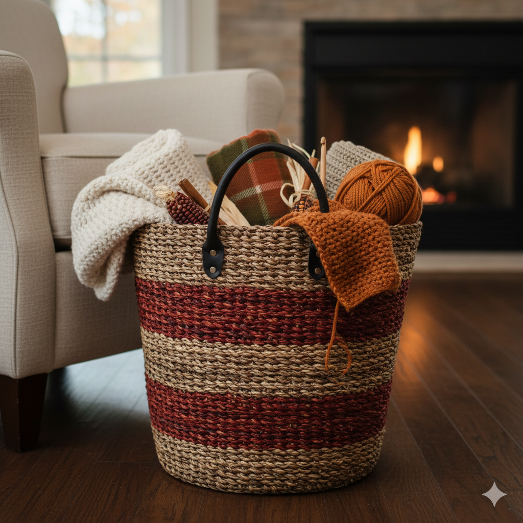 A sturdy, generously sized basket made in earthy browns or deep reds can hold anything from extra throw blankets to your current WIP (work in progress).
