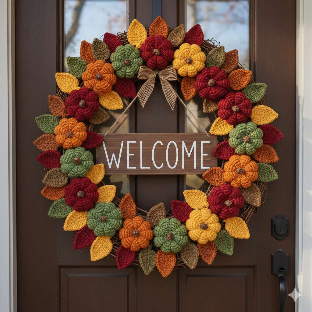 - Fall Wreath with Crochet Leaves & Pumpkins: