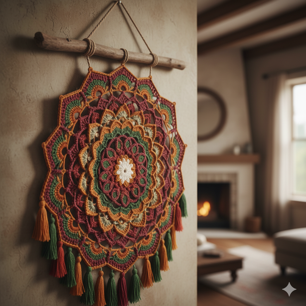 For a more decorative touch, a mandala in warm, deep autumnal hues brings a beautiful, artistic focal point to a wall. It adds texture and color in a unique way—a lovely, unexpected piece of fall decor.
