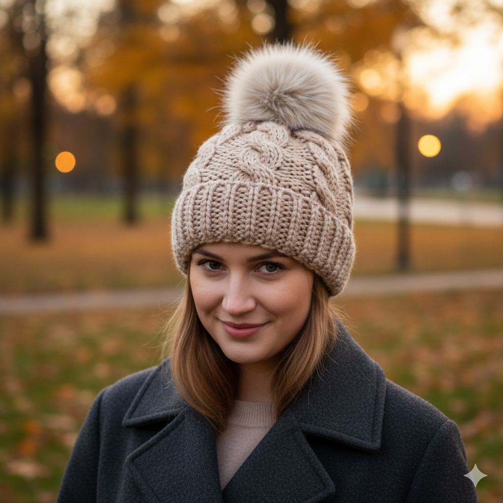 A simple beanie becomes instantly chic and cozy with the addition of a luxurious faux fur pom-pom. Choose a versatile neutral yarn, like oatmeal or charcoal, so it pairs easily with any fall coat.