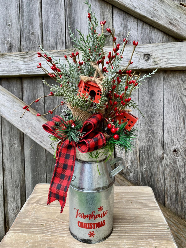 I think this one might just be my favorite. I came across an old milk can, filled it with evergreens and a few red berries, and set it right by the front door. The look was so effortlessly charming—it gave that perfect farmhouse feel without me even trying.